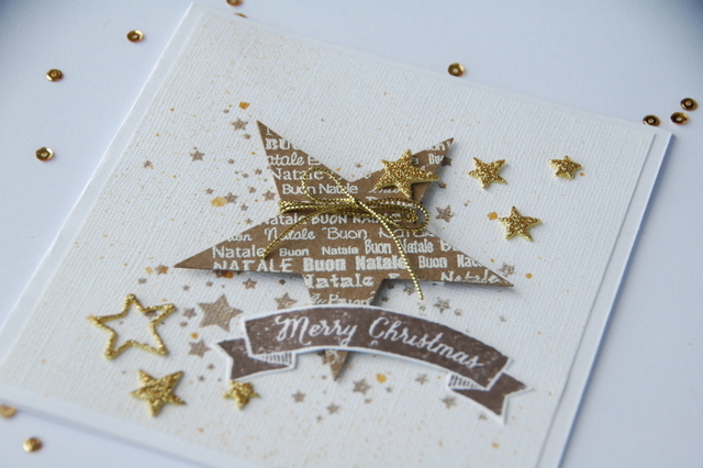 E' una delle card che abbiamo realizzato al corso di card natalizia, lo sfondo è fatto con l'acqua color dorato, e l stelline sono timbrate col memento, poi ho aggiunto le stelline di gomma crepla dorata, semplice ma carina, utile per un pensiero veloce, in questo periodo in cui le card non bastano mai! ;)